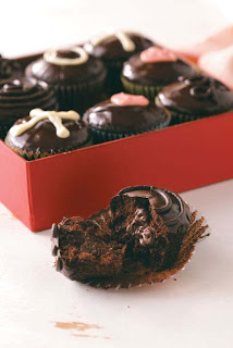 Dip tops of cupcakes in bittersweet ganache. Tint white ganache as desired, pipe designs over tops. Refrigerate until set. Sore in an airtight container in the refrigerator.