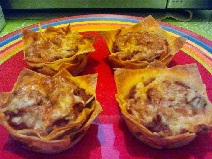 right on top of each other. Repeat this until you've built 3 layers total (wrapper, meat sauce, ricotta, wrapper, meat sauce, ricotta, wrapper, meat sauce, Mozzerella, Parmesan) Finish each cupcake